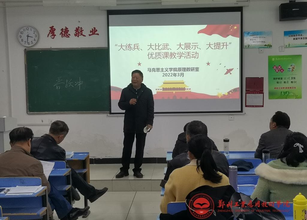 (文/李双)根据《省委教育工委河南省教育厅关于开展全省公司思想政治理论课教学技能“大练兵、大比武、大展示”活动的实施意见》,结合公司开展的“思政课教学大练兵优质课活动月”活动,3月29日下午,beats365唯一官方网站原理教研室在文华楼1-105教室开展思政课优质课教学比赛活动,共有10名青年教师参加比赛,8名教授担任评委,原理教研室全体专职教师全程观摩比赛。