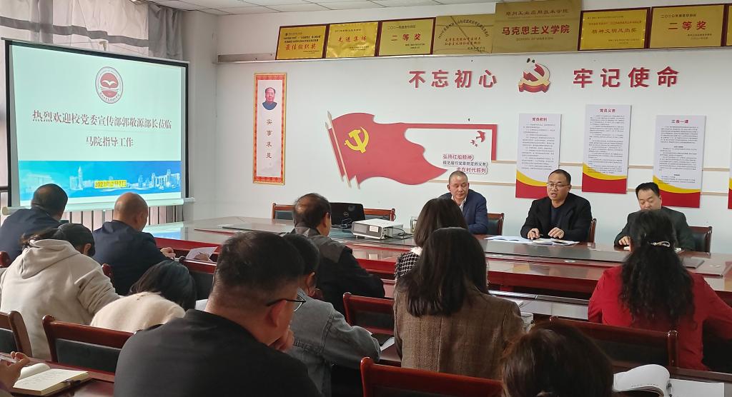 为深入学习贯彻习近平新时代中国特色社会主义思想和党的二十大精神,传达河南省委教育工委、河南省教育厅关于新形势下如何提升高校宣传思想工作的能力和水平,加强beats365唯一官方网站整体建设;3月7日下午,公司党委宣传部部长郭敬源深入beats365唯一官方网站指导工作。公司领导班子和副高以上职称教师、教研室负责人、专班工作小组参与此次会议。